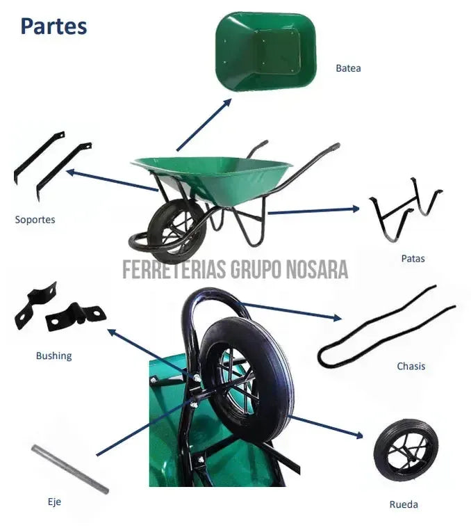 Designed especially for heavy work such as construction. They have high quality material, painted and reinforced structure with solid rubber wheels for better handling and resistance. Transform the way you handle heavy materials in your construction projects with a durable and strong structure, made with high quality materials. Forget about fatigue and handling problems with the solid rubber wheels that guarantee smooth and safe movement. Your heavy work will be more efficient and less exhausting with our Green Spartacus wheelbarrow!