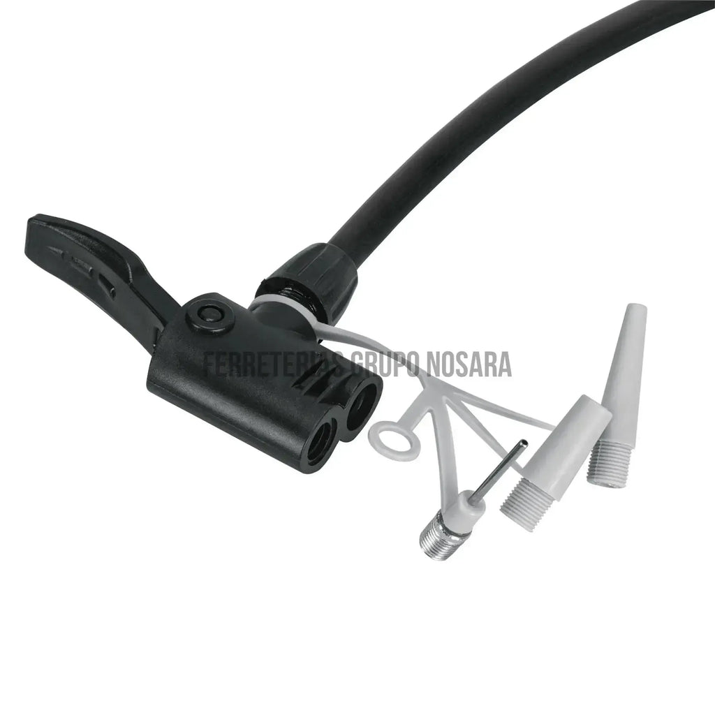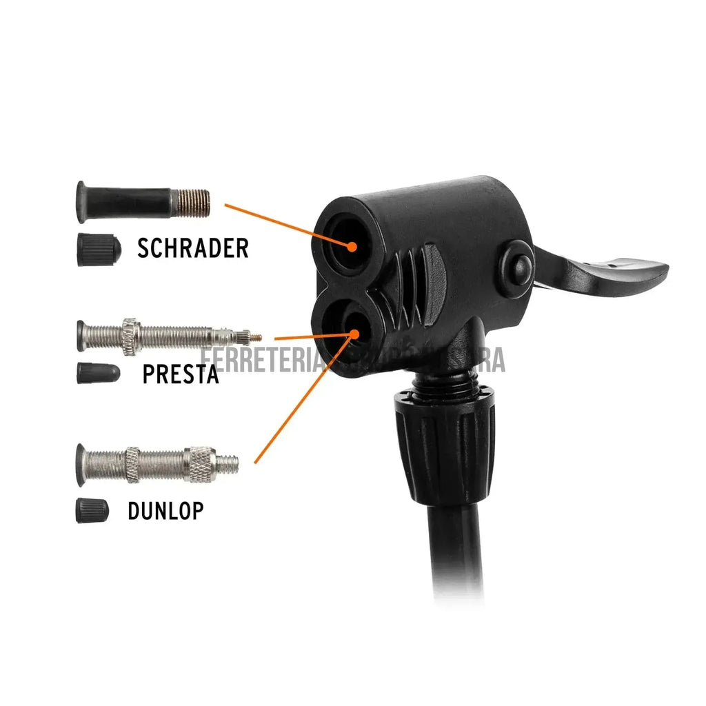 Dual head allows the use of European (Presta), American (Schrader) and Dunlop valves