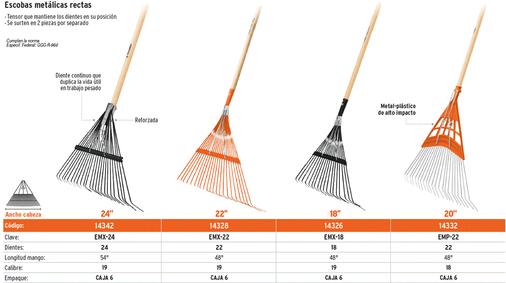 Straight head metal garden rake broom, 18 teeth, Truper / 14326